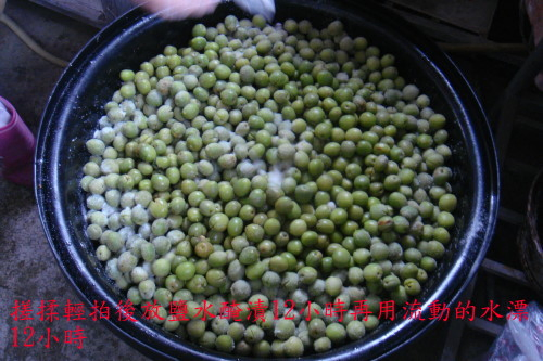 步驟2~將青梅輕拍、再將梅子放置桶中注入鹽水、浸泡12小時、再用流動的水漂12小時後取出瀝乾。